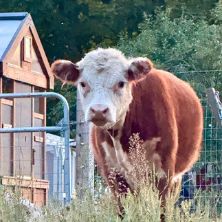 Fencing the larger pasture happened in fits and starts, as we prioritized weekends and free time to getting this done. With family's help, by mid-summer we were ready to welcome the next iteration of livestock: some beef cows. We initially thought to focus on mini polled Herefords and found a year-old heifer, Harper, for sale not too far from us. Wanting her to have a pasture-buddy, we found a Shorthorn-Hereford heifer named Clover and the two quickly formed our small herd.